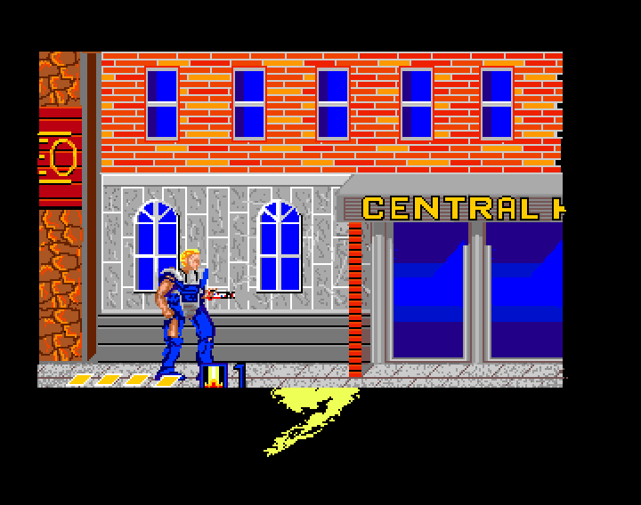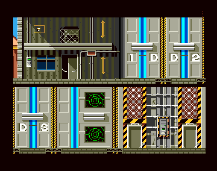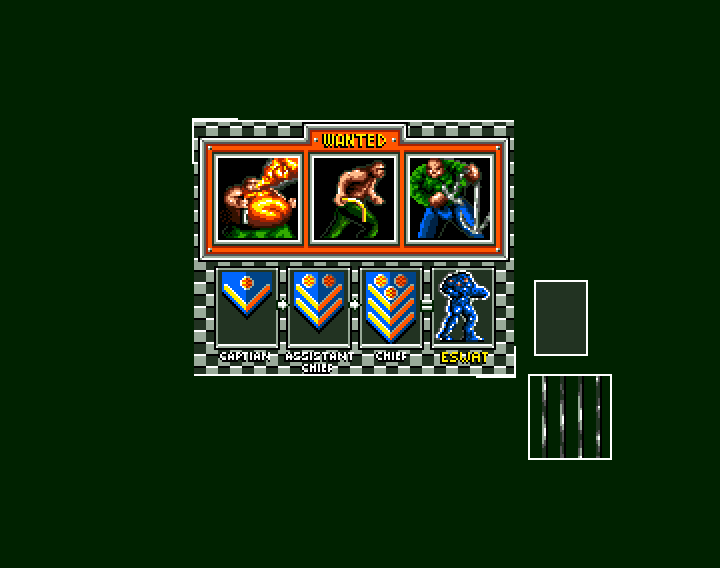 The exact timing of our obsession with making things look like they were being played on a Sega Game Gear is difficult to pin down. But I think it can be safely said that it began with the decision to shrink down Alien Storm after considerable difficulties with speed. The whole Game Gear thing became rather appealing and GG Eswat is one of the resultant babies. Eswat was a pretty cool game in the arcades and so, with footage taken with a video camera of most of the game, we set about it. It's not easy working from incomplete video camera footage and a few screenshots, but that never put us off trying. It became quite clear that I was going to have to program the damn game, so we settled for the most minimal approach to gameplay as possible. It's not much of a game really, more of a graphics demo with some very bad music, although some of the bosses require a bit of learning to defeat. For anyone who downloads the ADF file to play, there is a cheat that forces the game to load the boss up, skipping the level and removing some of the boss attacks. While playing, just push * (star). Sometimes this works as it should, other times it will continue to skip all levels automatically, which is a bit of a pain. Make sure your joystick is plugged in before playing, there is no keyboard option to be found here.